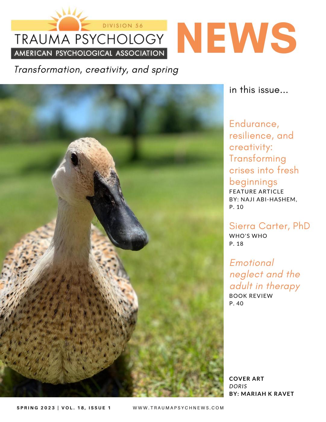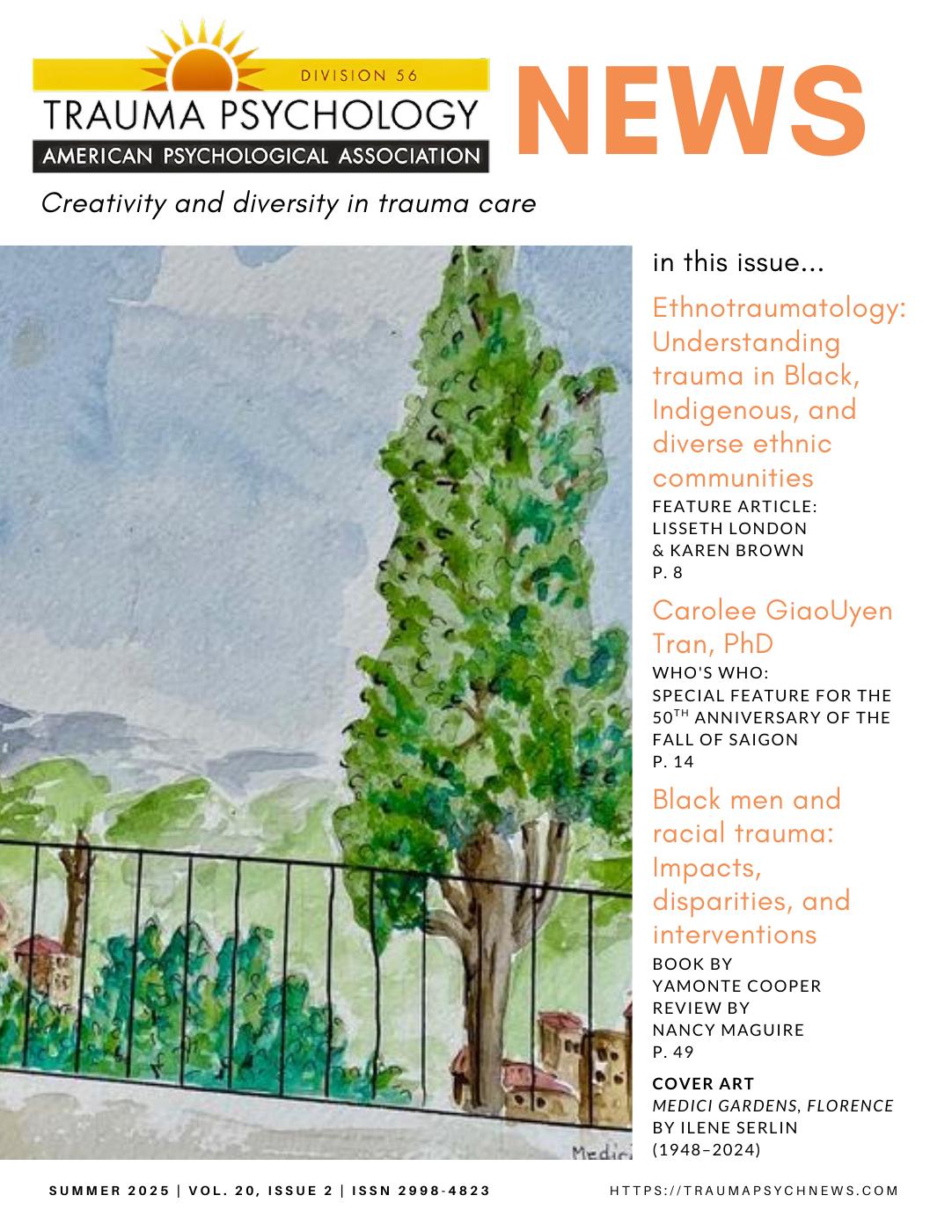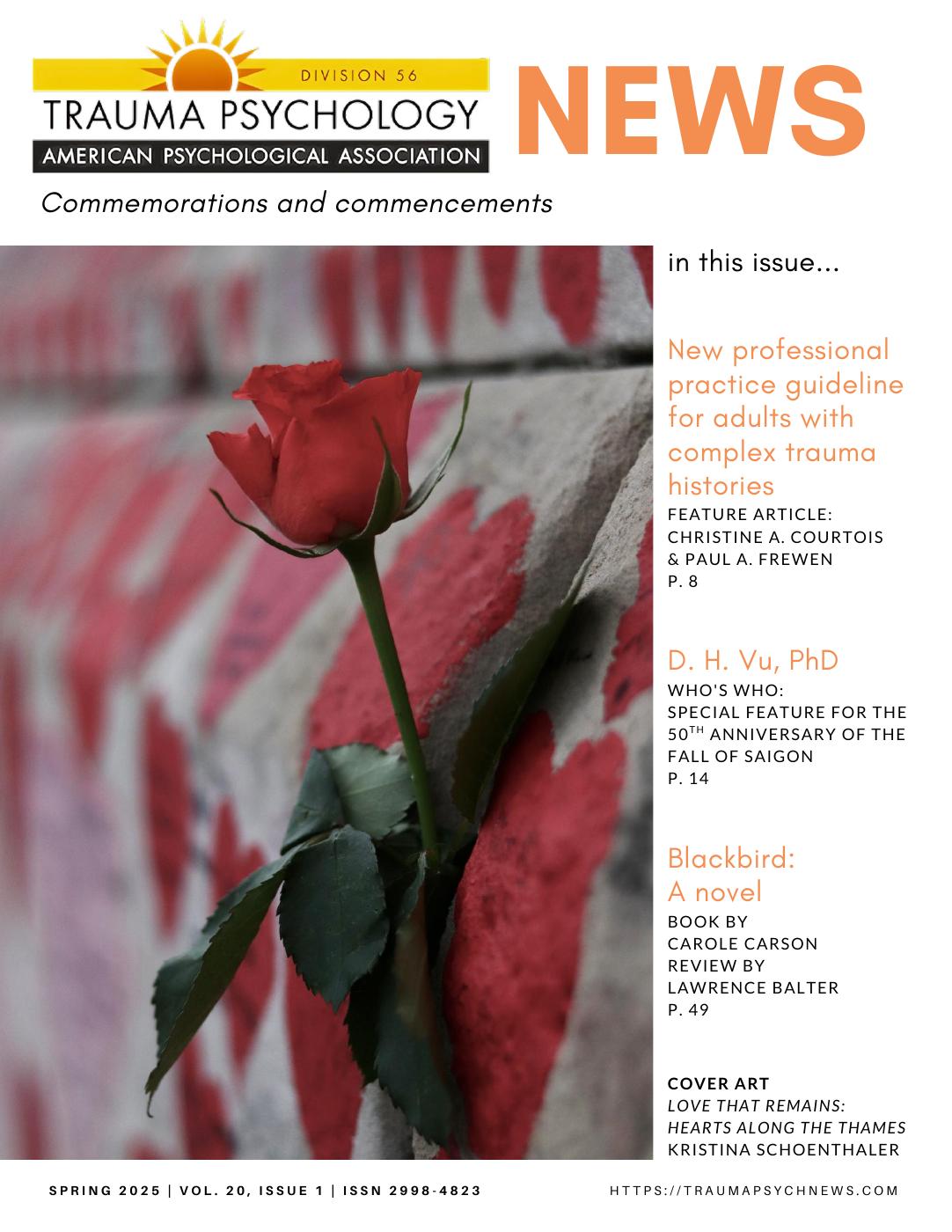 TPN is distributed to the entire Division 56 membership, which includes academics, clinicians, students, and affiliates who share a common interest in trauma psychology, as well as to interested parties via the Division website. Unless otherwise stated, opinions expressed by authors, contributors, and advertisers are their own and not necessarily those of APA, Division 56, the editorial staff, or any member of the editorial advisory board.